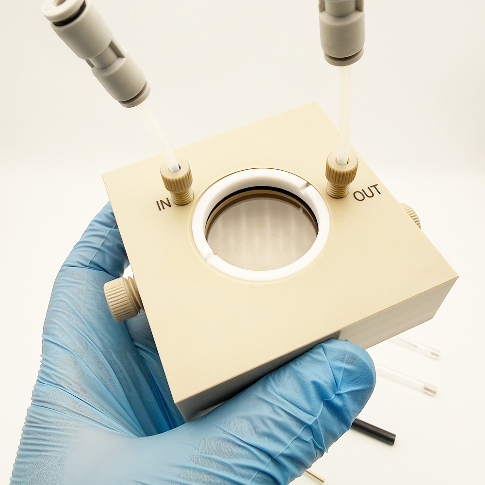 2.The size of the cell body is 80*80*27mm.The internal electrolyte solution part is a space of φ55*13mm, and the volume is 30ml.